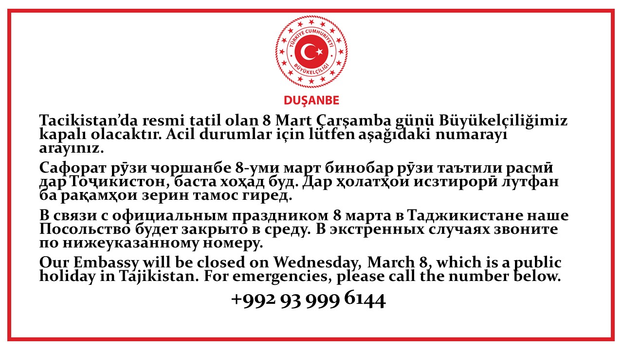 Tacikistan’da resmi tatil olan 8 Mart Çarşamba günü Büyükelçiliğimiz kapalı olacaktır. Acil durumlar için lütfen aşağıdaki numarayı arayınız.
